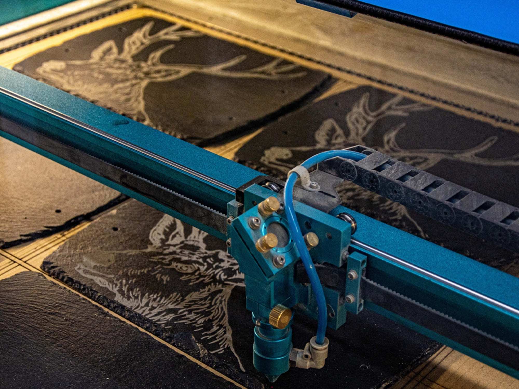 That same year, we introduced in-house engraving, led by Emma’s hand-drawn designs. Our slate and oak products were transformed into keepsakes, featuring much-loved motifs like stags, highland cows, and thistles. Customer enthusiasm saw us grow from one engraving machine to eight.